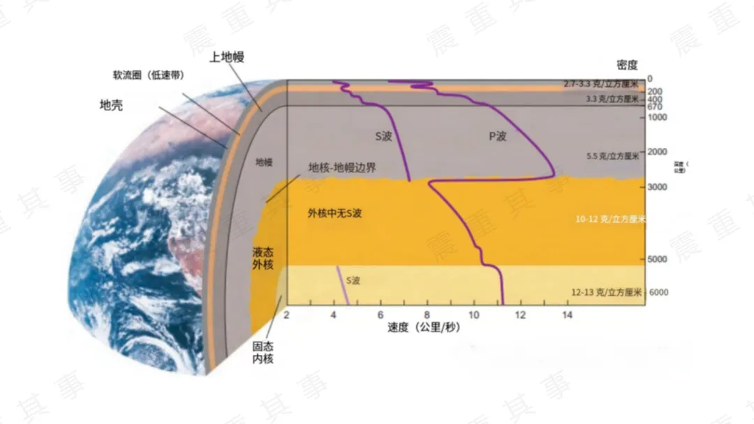 这张图展示了地球内部的密度变化和地震波的传播速度变化,大家能看到:地壳和地幔的密度从2.7克/立方厘米慢慢增加到5.5克/立方厘米;到了地核,密度骤增到10-13克/立方厘米。而横波在进入外核后就消失了,这也证明了外核是液态的,只有纵波能在其中传播,内核则是固态的,横波又能传播了。