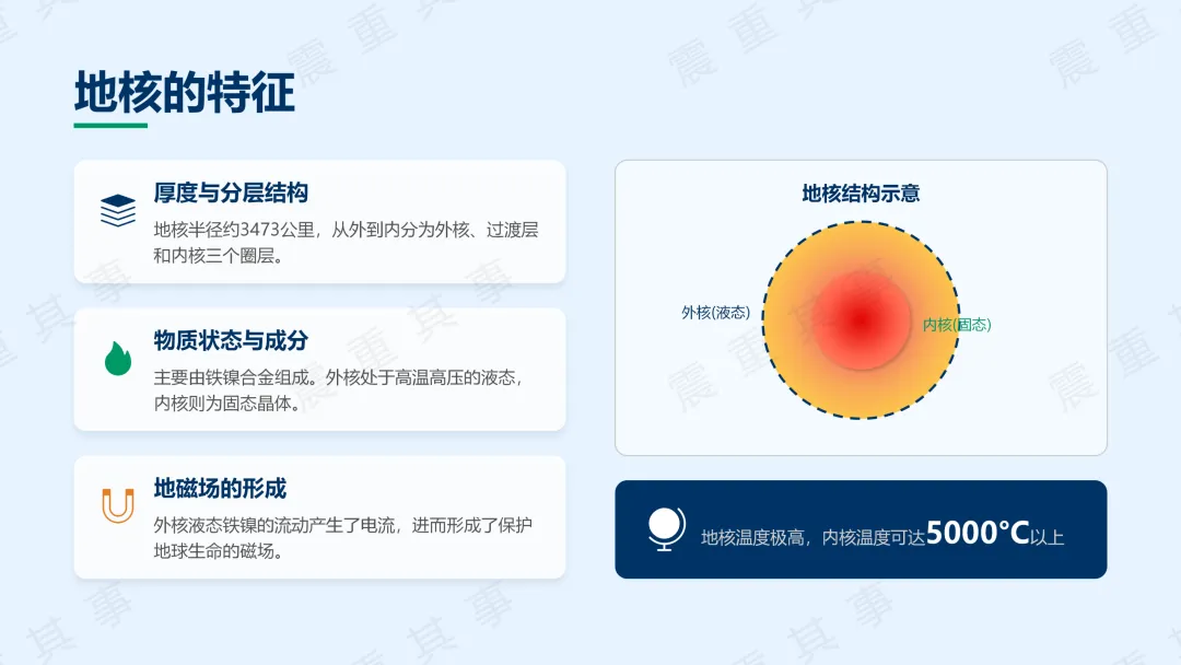 接下来我们认识地球最核心的圈层——地核,它位于古登堡面以下,到地球球心,是地球内部温度、压力、密度最高的区域,我们从厚度分层、物质状态、地磁场形成这几个方面来看。