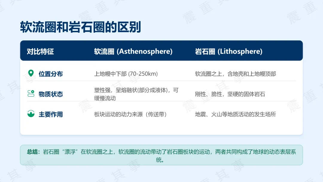 最后是主要作用:软流圈是板块运动的动力来源,就像一个“传送带”,通过自身的流动带动岩石圈运动;而岩石圈是地震、火山等地质活动的发生场所,因为岩石圈的板块相互碰撞、张裂,就会引发地震和火山喷发。