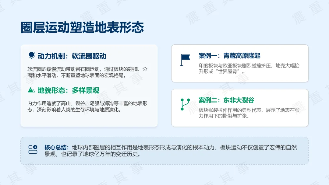 这里做个核心总结:地球内部圈层的相互作用,尤其是软流圈驱动的板块运动,是地表形态形成和演化的根本动力。我们现在看到的各种宏伟的自然景观,都是板块运动的结果,而这些景观也记录了地球亿万年的变迁历史,是地球演化的“活化石”。