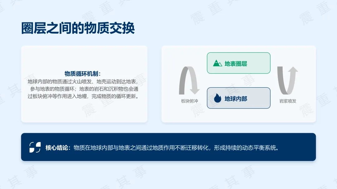 核心结论就是:物质在地球内部和地表之间,通过火山喷发、板块俯冲、地壳运动等各种地质作用,不断地迁移、转化,最终形成了一个持续的动态平衡系统。这种物质交换,让地球的各个圈层紧密联系在一起,也让地球始终处于动态的演化之中。