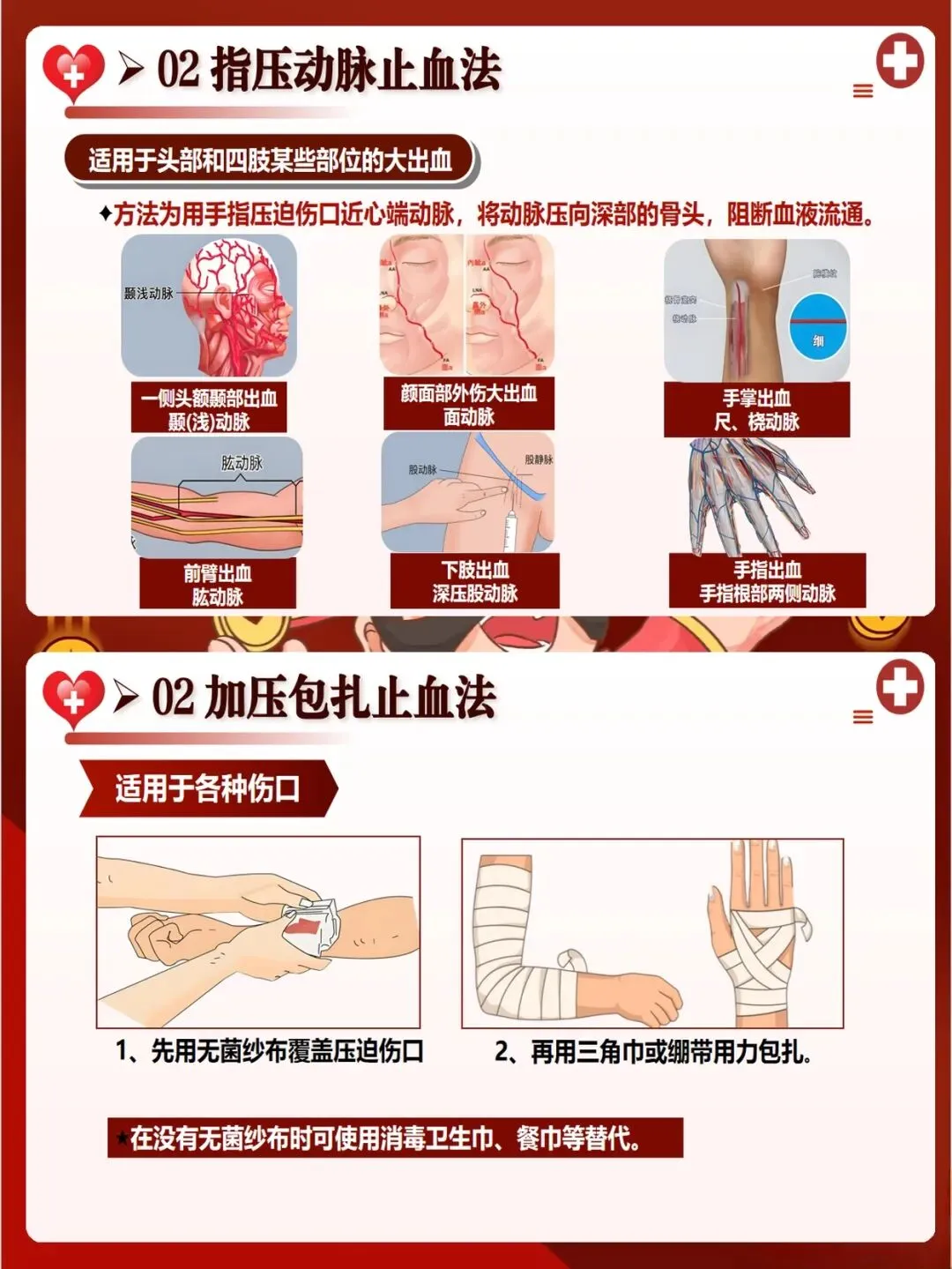 指压止血法是最快速的临时止血措施,用手指或手掌压迫伤口近心端的动脉,阻断血流。常用压迫点包括颞浅动脉(颞部出血)、面动脉(面部出血)、颈总动脉(颈部大出血,慎用,避免压迫颈动脉窦)、锁骨下动脉(肩部出血)、肱动脉(上臂出血)、股动脉(下肢出血)。压迫时力度适中,以能止血为宜,避免损伤神经。