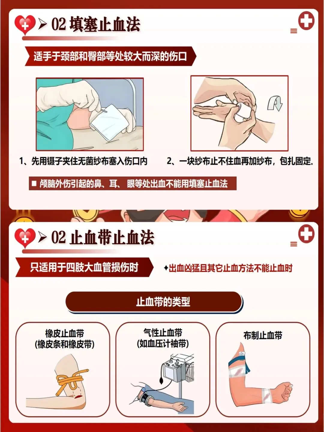 快速识别出血类型是止血的前提。动脉出血呈喷射状,颜色鲜红,出血量大,需立即控制;静脉出血呈涌出状,颜色暗红,流速相对缓慢;毛细血管出血呈渗出状,可自行凝固。大出血患者可在数分钟内进入休克状态,必须争分夺秒。