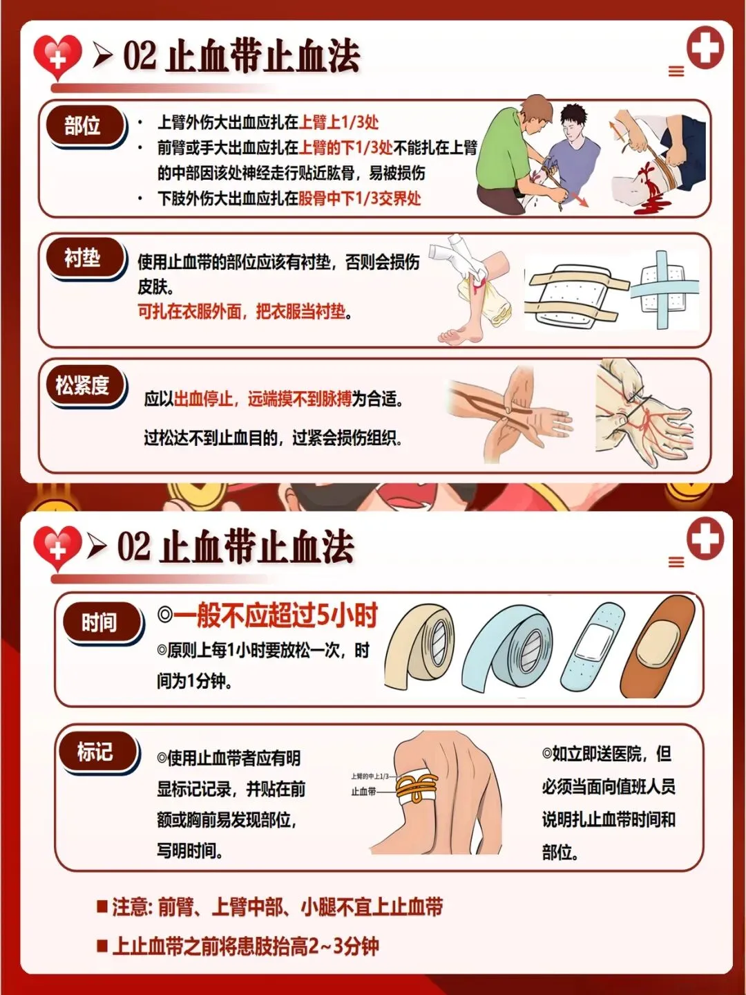 止血带止血法仅适用于四肢大动脉出血且其他方法无效时。使用气压止血带或宽软布带,位置尽量靠近伤口近心端,避开关节。记录上带时间,每隔1小时放松1-2分钟,避免肢体缺血坏死。放松时需用指压法临时止血。