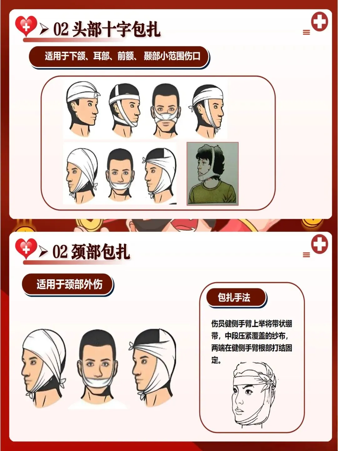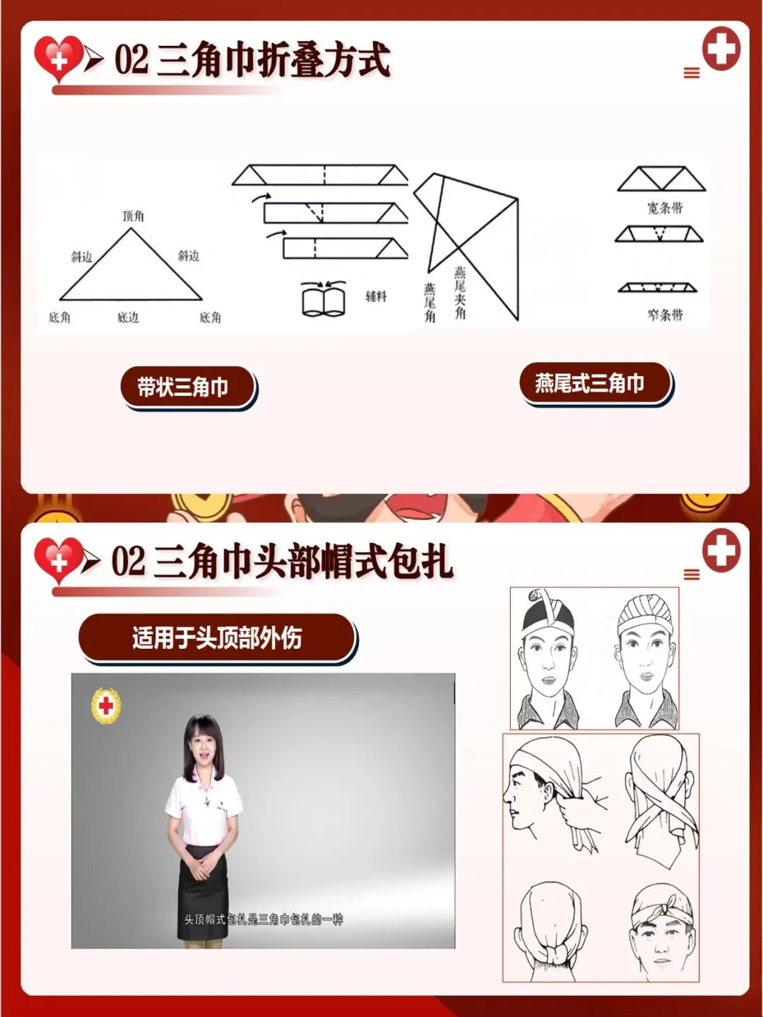 三角巾包扎法适用于大面积伤口、悬吊固定等场景。可制作成帽式、面具式、肩部悬吊、大手挂、小手挂等。三角巾使用灵活,便于携带,是现场急救的重要工具。