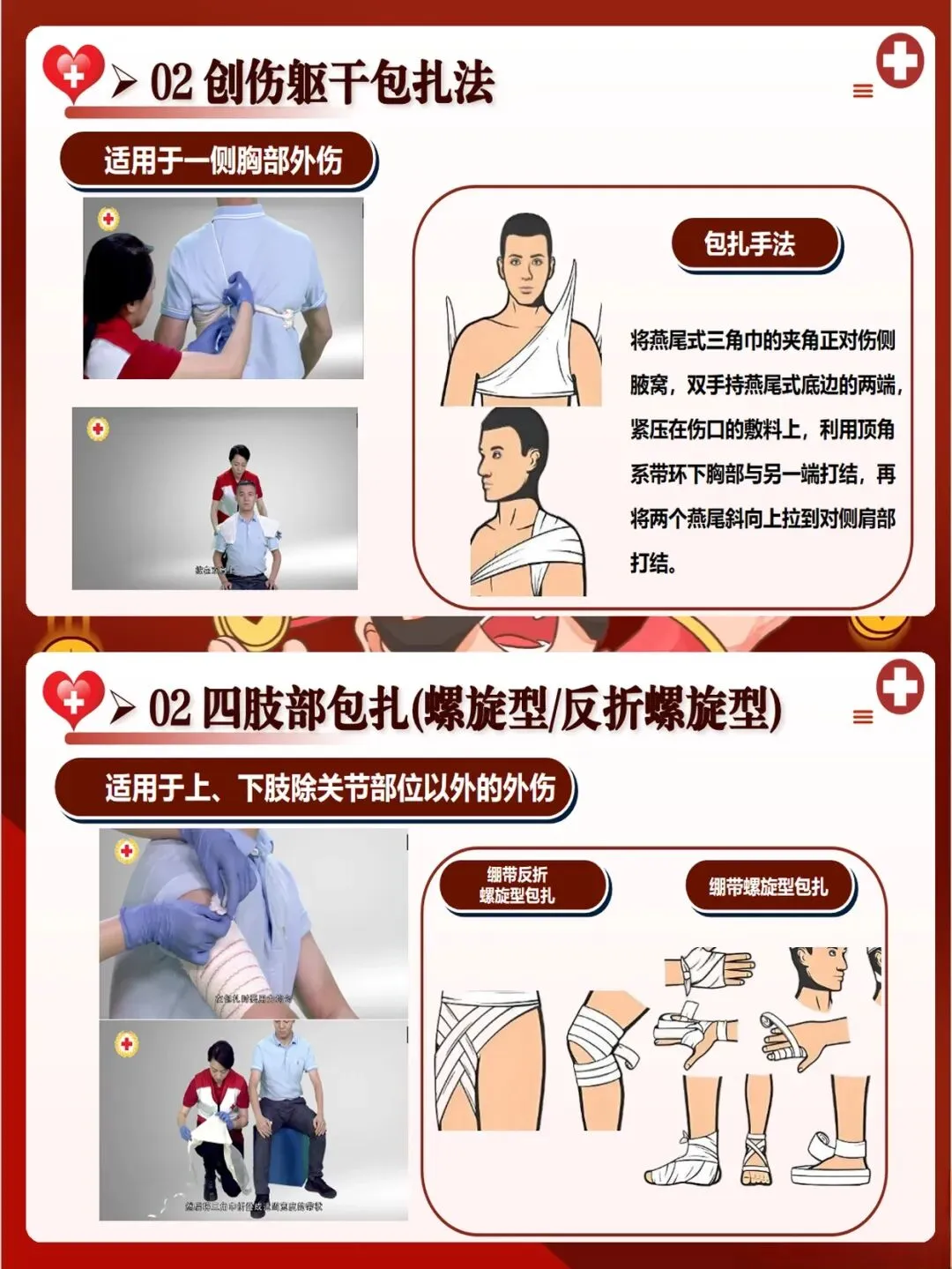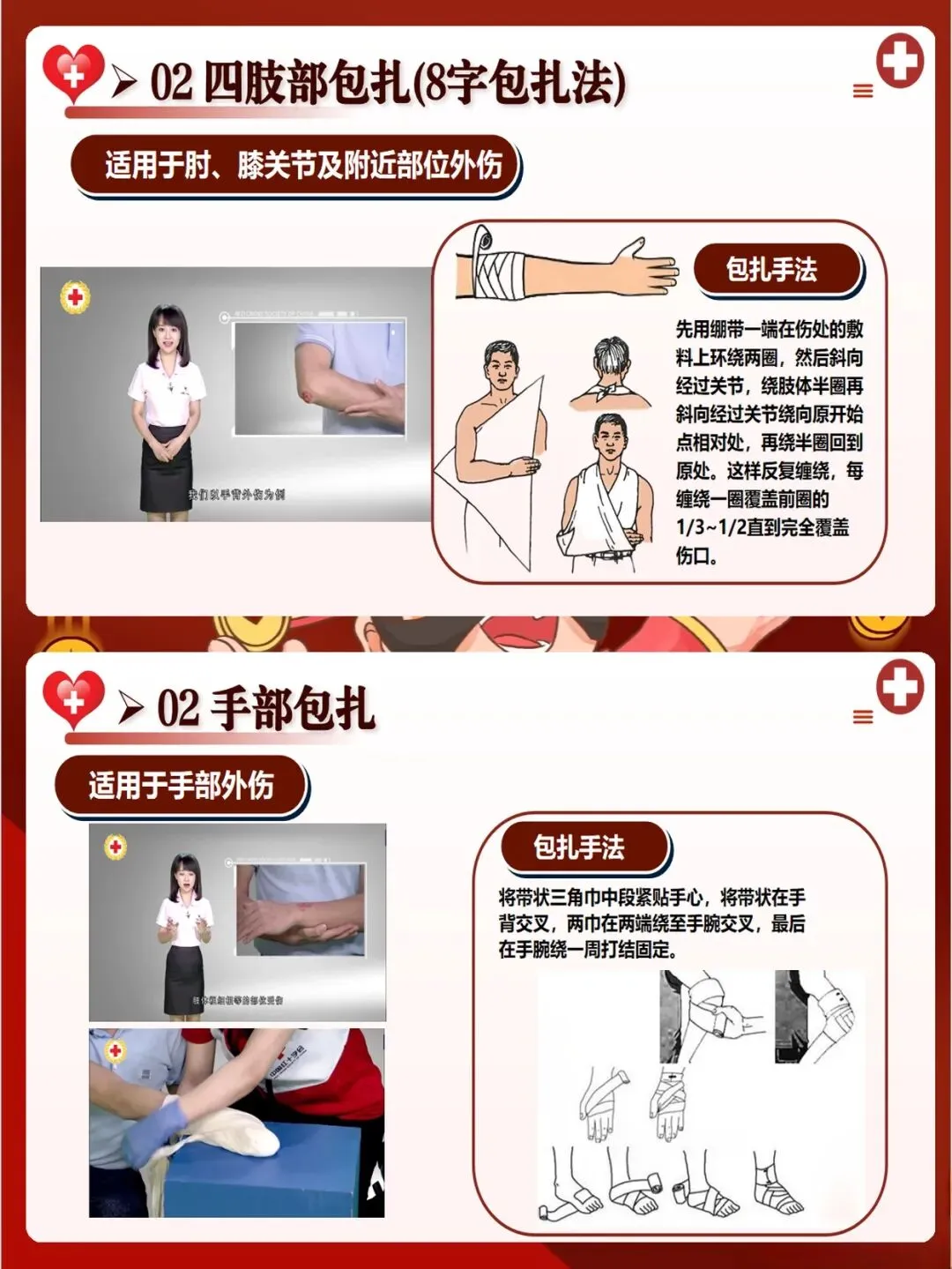 绷带包扎法是最常用的包扎方法,有环形、螺旋形、螺旋反折形、"8"字形、回返形等多种手法。环形包扎用于粗细均匀部位(如额头、手腕);螺旋形包扎用于肢体;螺旋反折形用于粗细不均部位;"8"字形包扎用于关节;回返形包扎用于残端、头顶。
