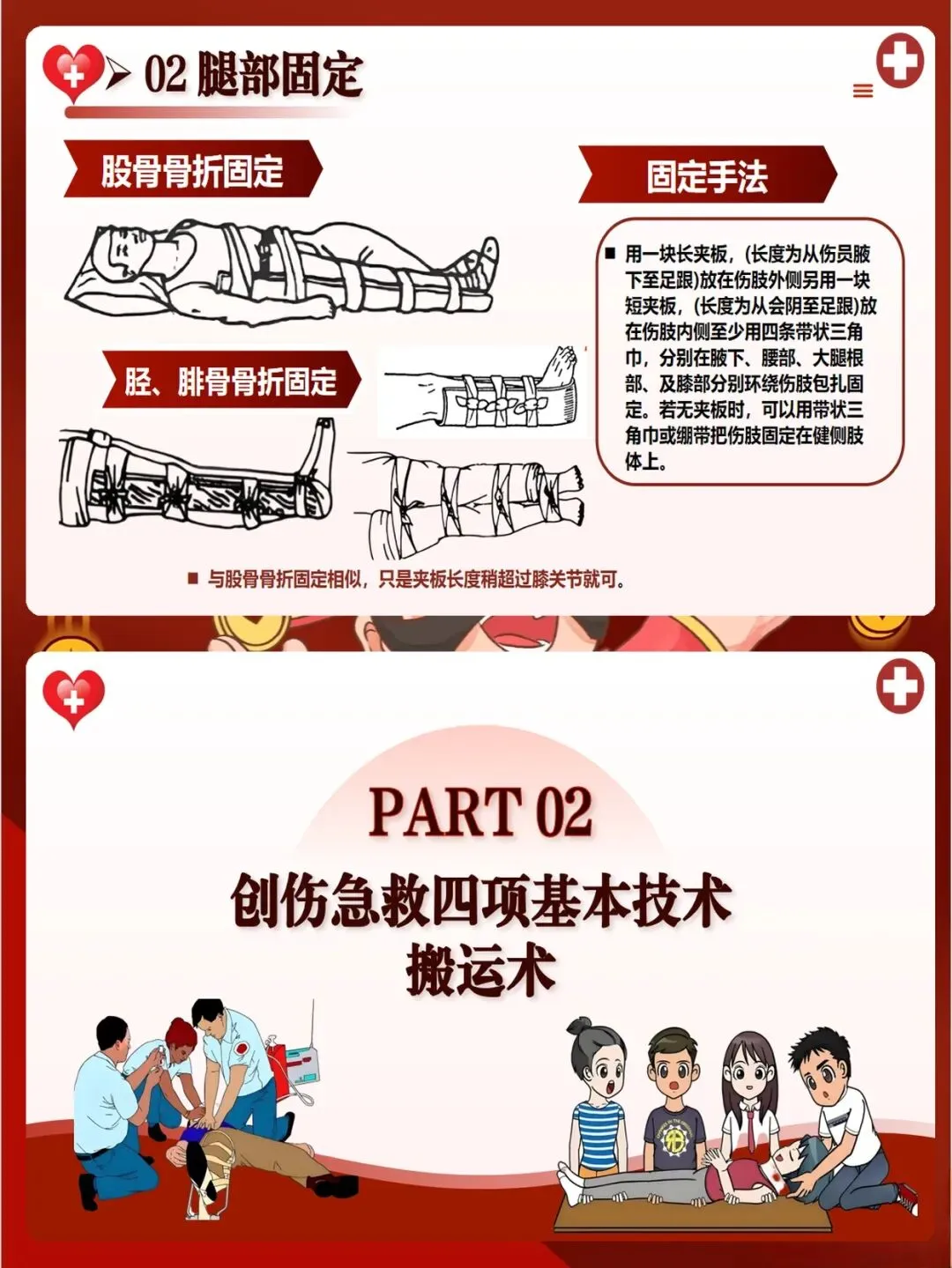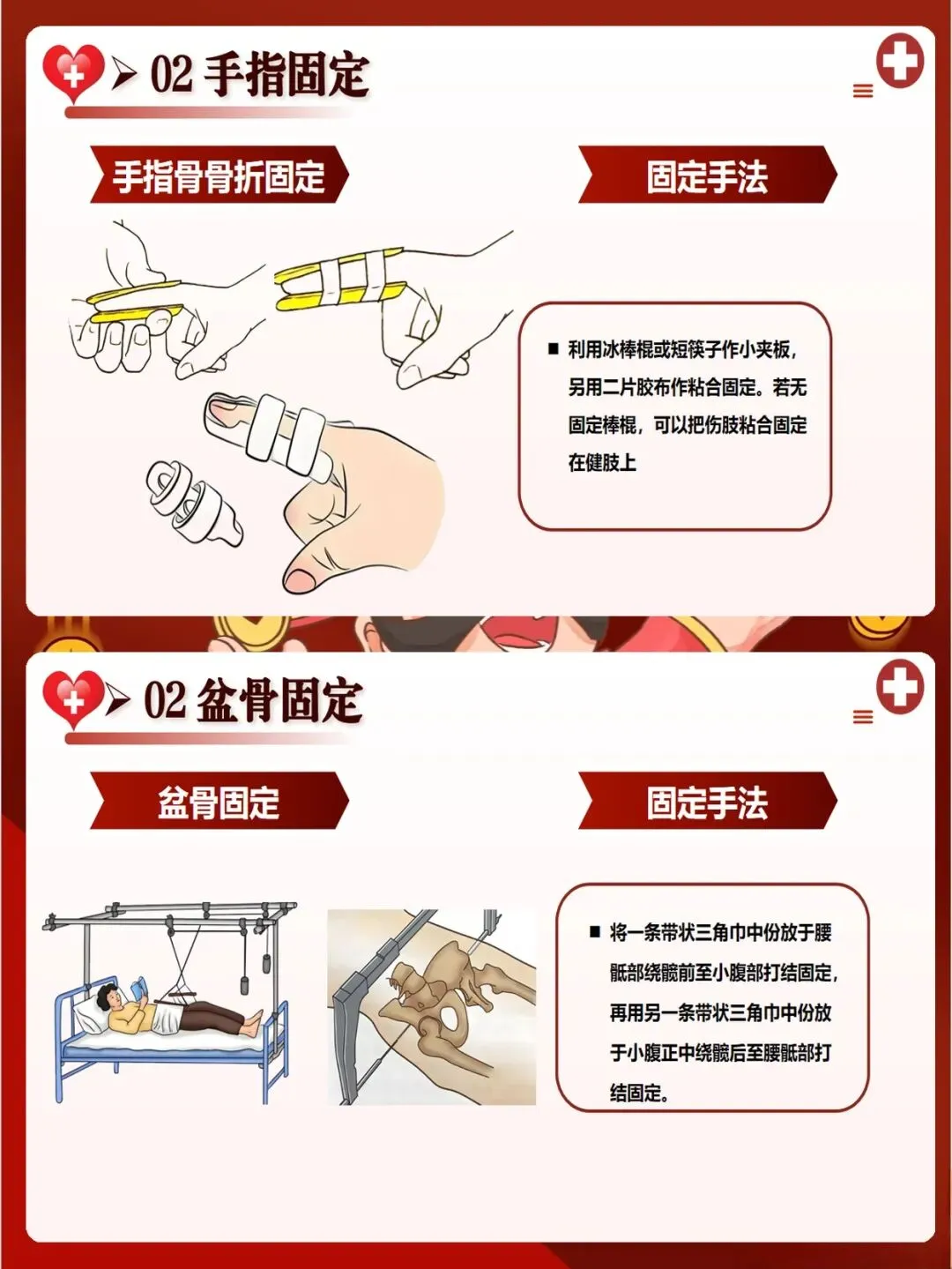 下肢固定:用夹板固定髋、膝、踝关节,长度应超过上下两个关节。股骨骨折需用长夹板固定,从腋下到足跟。无材料时,用绷带将患肢与健侧肢体绑在一起。