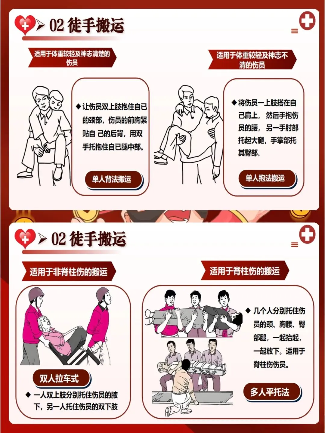 单人搬运适用于轻伤员,包括扶持法、背负法、拖拽法。扶持法用于能行走的伤员;背负法用于无法行走但意识清醒的伤员;拖拽法用于紧急情况,拖拽衣物,避免直接拖拽肢体。