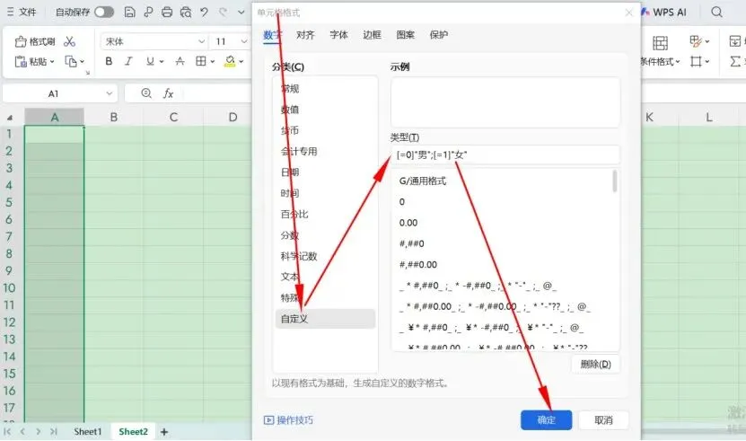 在弹框里,选择“自定义”,在“类型”里填写格式代码,如想录入性别,则输入[=0]"男";[=1]"女",点击“确定”就可以了。