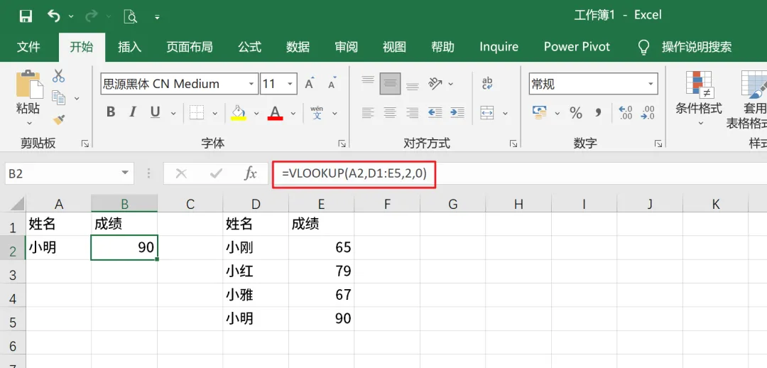如图,使用VLOOKUP函数查出小明的成绩。