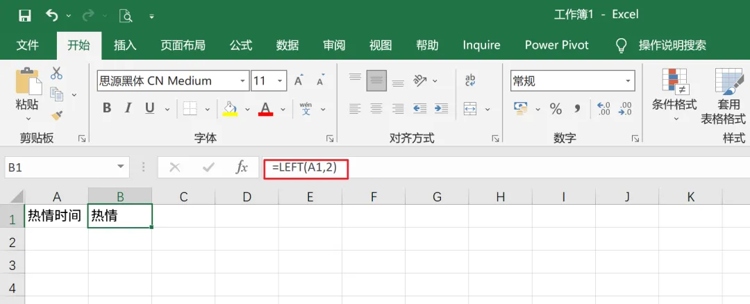 如图,使用LEFT提取2个长度,就能提取“热情”这个词语。