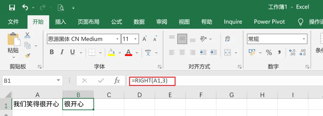 如图,使用RIGHT提取3个长度,就能提取“很开心”这个词语。