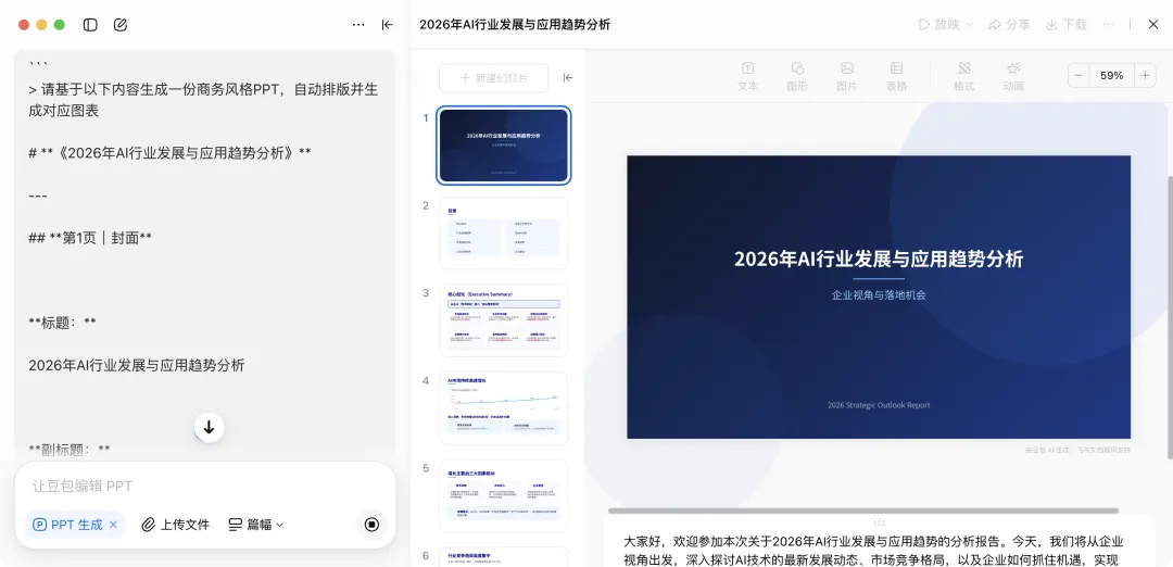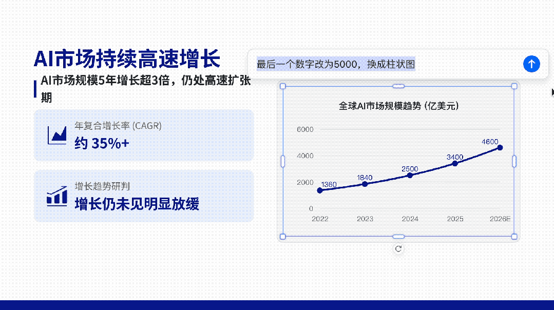 修改图表数据,替换图表类型。可以看到指令遵循是不错的,修改完全符合要求。如果要说缺点的话,就是这里生成的图表只能在豆包上 AI 编辑,导出到 PPT 之后是图片。(仅图表是图片,其他都可以编辑)