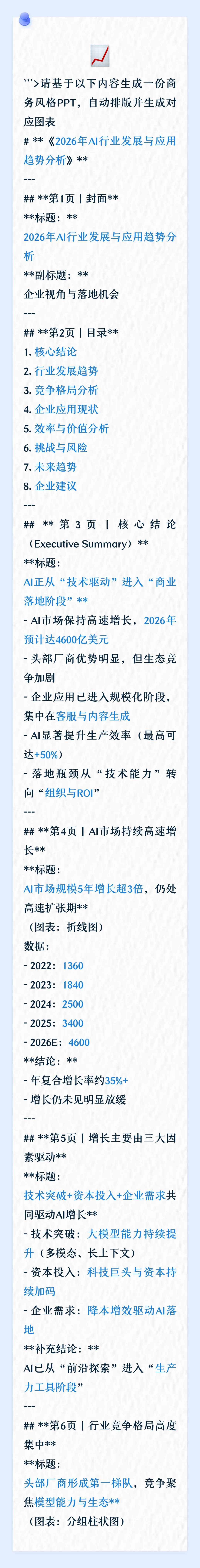 在实际使用上,我更建议尽量只给:首页、过渡页、尾页。正文页只给标题,正文内容留白。这样子反而 AI 能够更好地发挥,避免出现这种排版错误的问题。