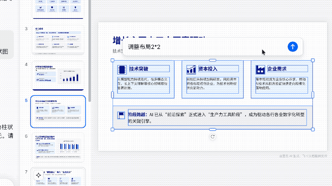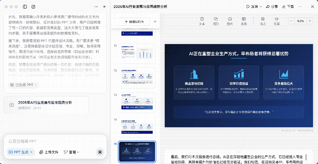 看到这个修改过程还是有点让人震惊的,它居然不是清空重新生成,而是一个元素一个元素地去拖动调整,就跟真正的人在操作一样。说明豆包 AI 对于 PPT 做出来的每一个元素都有绝对的控制力,也体现了豆包 AI 在 PPT 制作方面强大的潜力。虽然最后调整出来的布局稍微不够和谐,但是瑕不掩瑜,整体效果还是非常不错的。