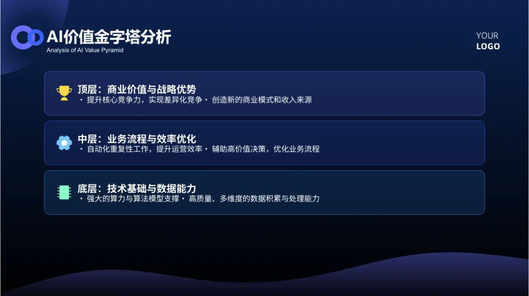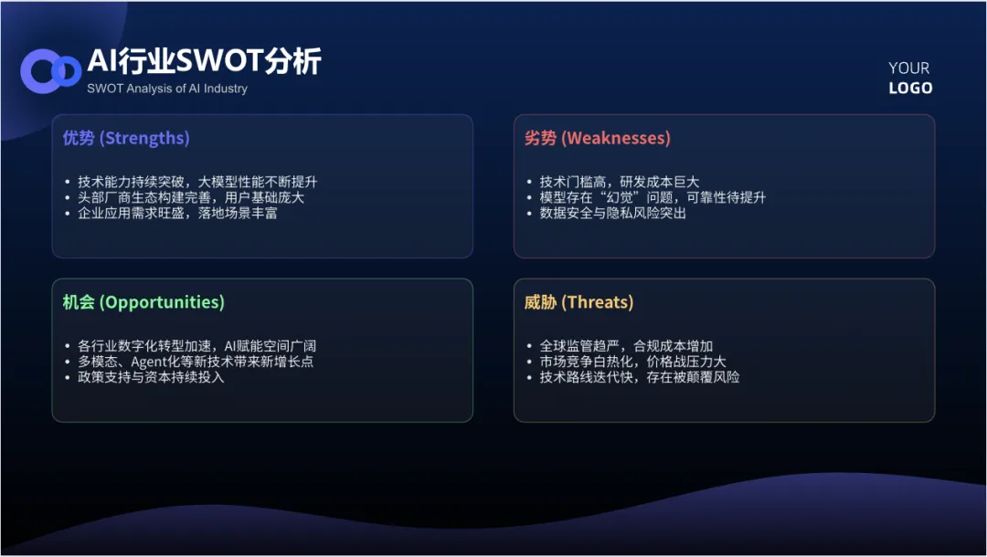 可以看得出来,在豆包 AI 里面其实并不存在“PPT 模板库”的概念。所以不管什么内容,生成的 PPT 样式都会比较类似。如果想要做一些这种经典的分析,也可以考虑:自己上传单页的模板,让豆包参考这个模板来做。