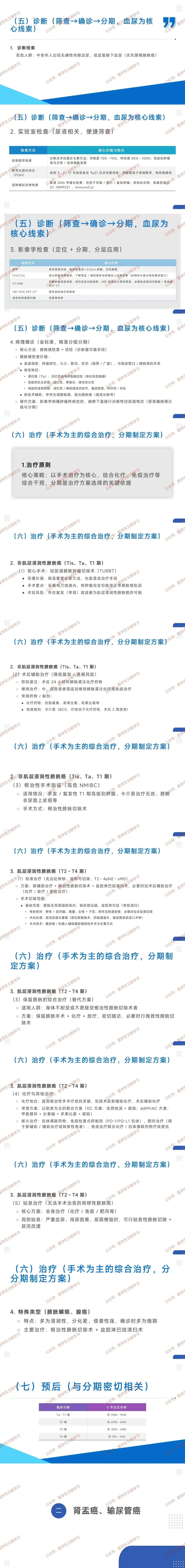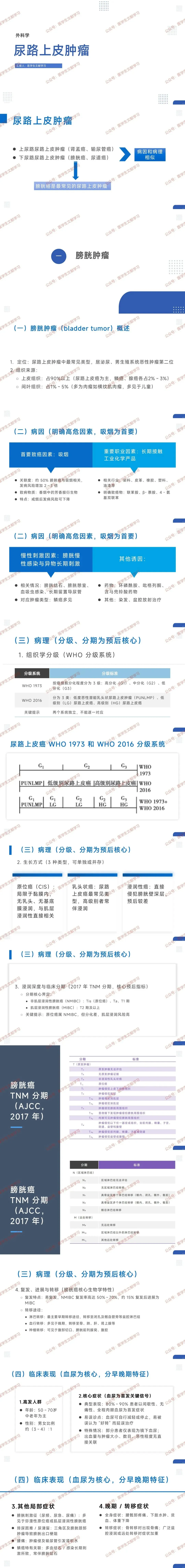 - 生物学特性:易复发(NMIBC 复发率 50%~70%,15% 进展为 MIBC),淋巴转移为主要早期途径,晚期血行转移至骨、肺、肝等。