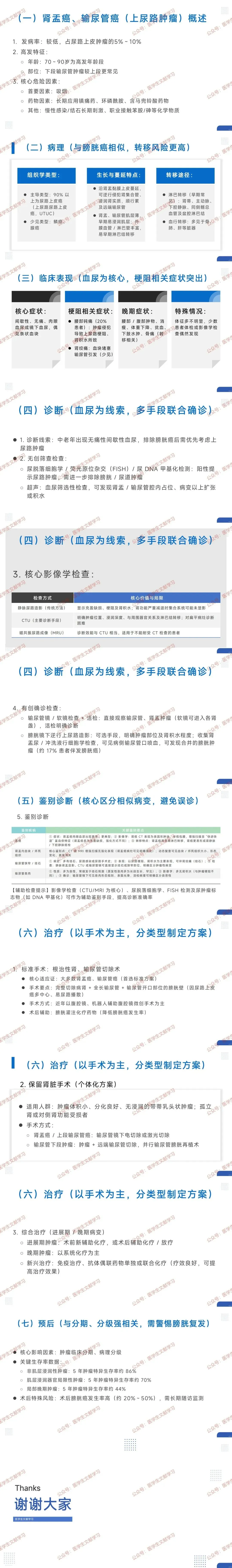 - 确诊与分期:CTU(主要手段,明确肿瘤位置、浸润深度)、MRU(不耐受 CT 者);输尿管镜 / 软镜 + 活检(金标准),膀胱镜逆行造影(辅助诊断,排查合并膀胱癌)。