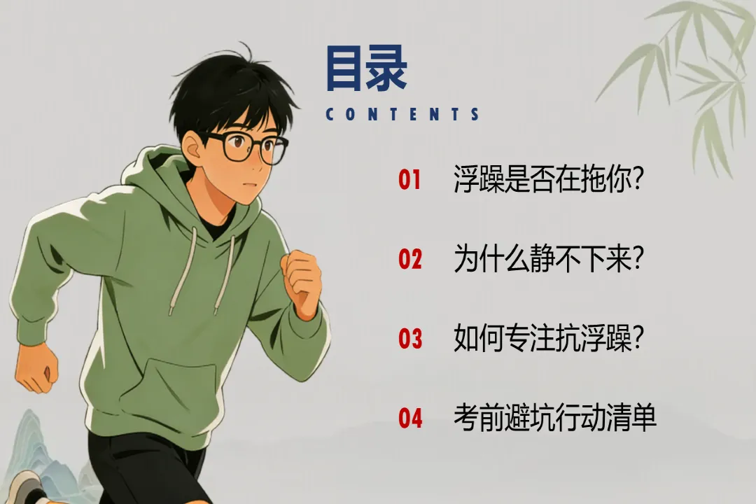 各位同学,今天咱们开这个考前复习班会,核心就一件事,跟浮躁掰扯清楚,别让它耽误咱们复习。