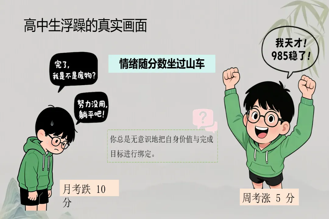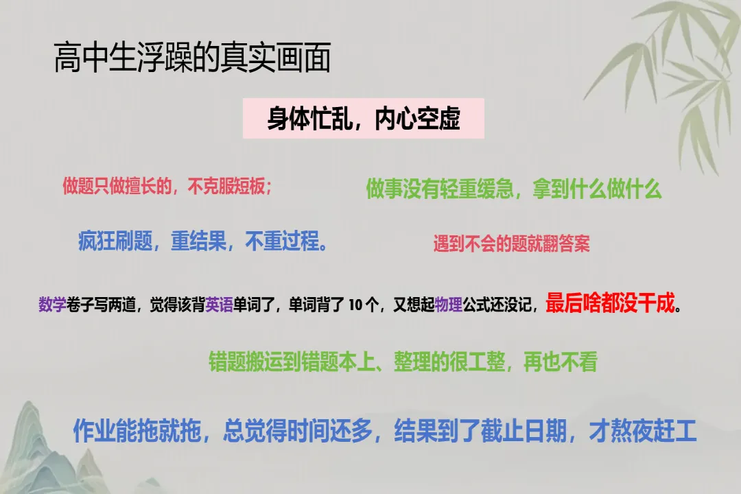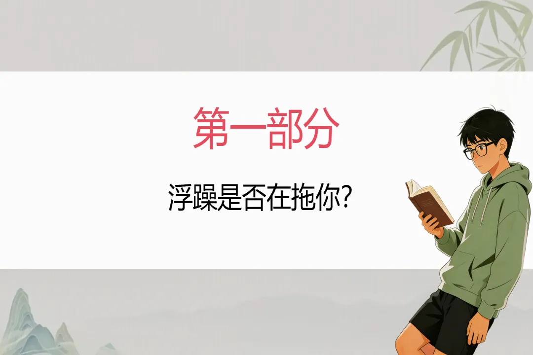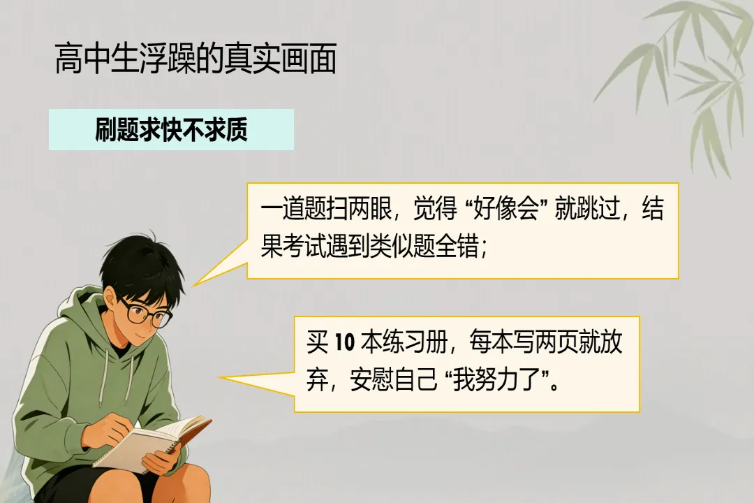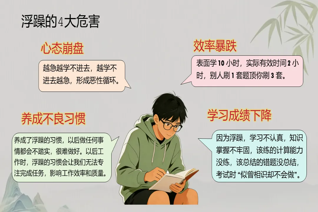 首先说说,浮躁是不是已经缠上你了?复习时五分钟一抬头,书翻半天还在第一页;刷题只求快,看着会就跳过,考试全错;分数高了就飘,低了就垮,总盯着别人,还总想着找速成秘籍,觉得不用吃苦就能提分。这些事,只要你占一样,就是浮躁在拖你后腿。浮躁的坏处不用多说,学习效率跌到底,成绩上不去,心态越来越崩,还会养成做事不踏实的毛病,不光影响现在,以后也受影响。