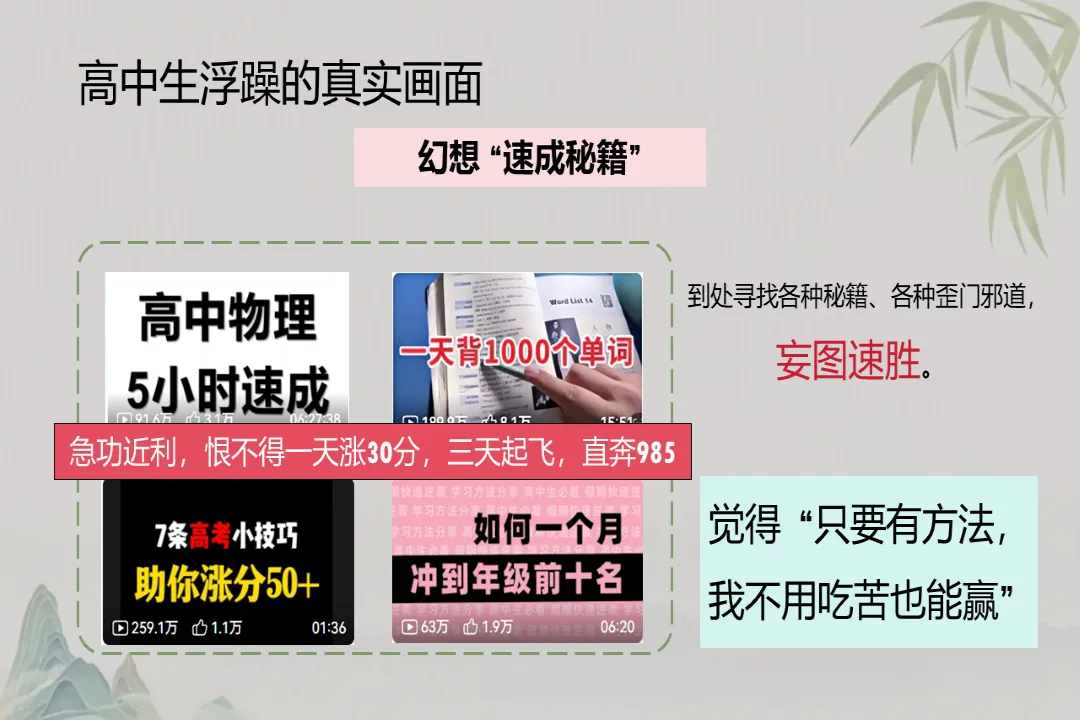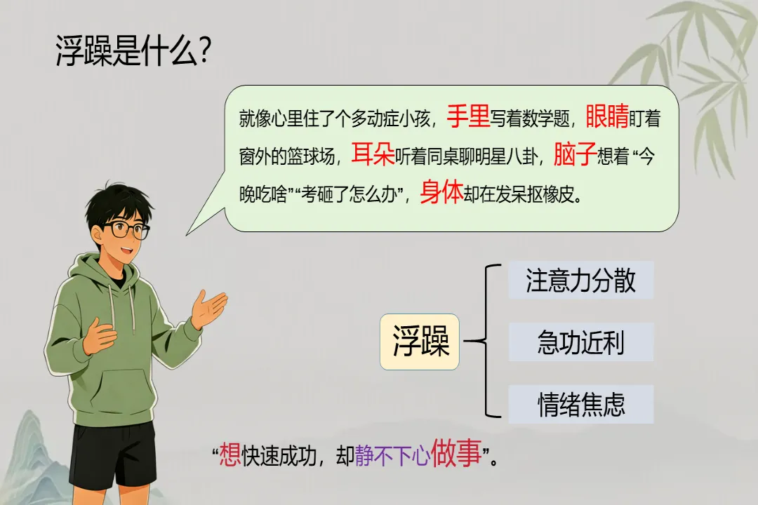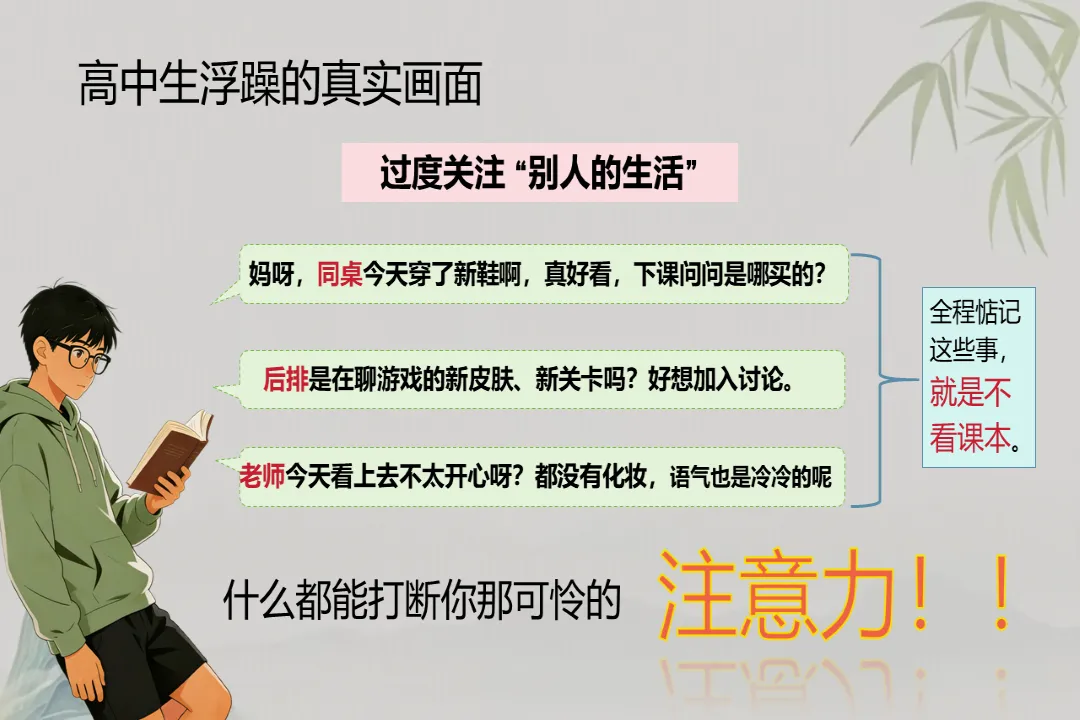 浮躁谁都有,学霸也不例外,区别就是人家能快速调整。现在开始静心,每天进步一点,到考试时就有大收获。记住三句话:注意力花在有用的事上,目标是路标不是鞭子,静下来的你比想象中强。高考是马拉松,别慌,沉下心一步步走,才能走到最后。