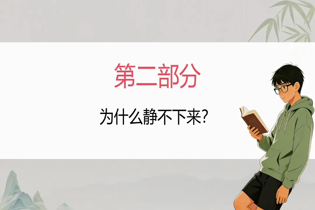 那为啥就是静不下来?第一,碎片化信息把注意力偷走了,刷短视频、听八卦习惯了,面对课本就坐不住;第二,把目标当成了枷锁,总觉得考不好就完了,一学习就焦虑,不敢面对错题;第三,身边的低能量影响了你,别人抱怨学习难、偷懒,你也跟着学,自然静不下心。
