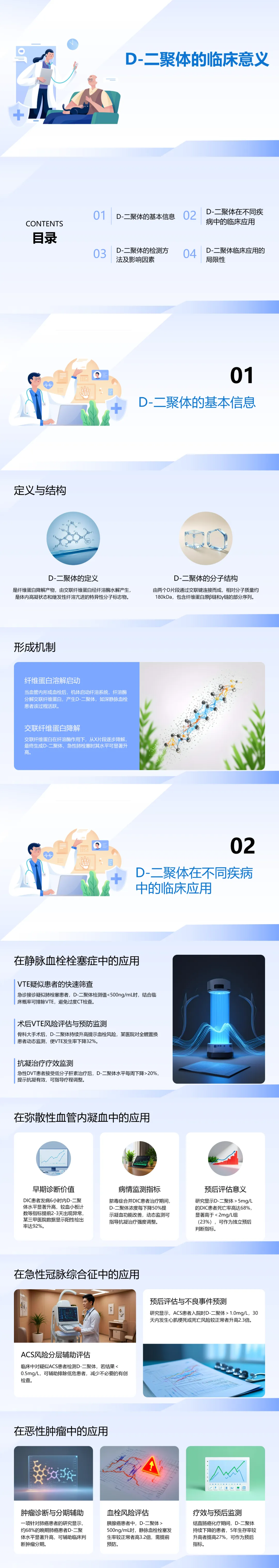 心血管疾病:急性心梗、脑梗患者的D-二聚体水平升高,提示血栓负荷较重,远期不良事件风险增加;可用于评估抗凝治疗的效果。