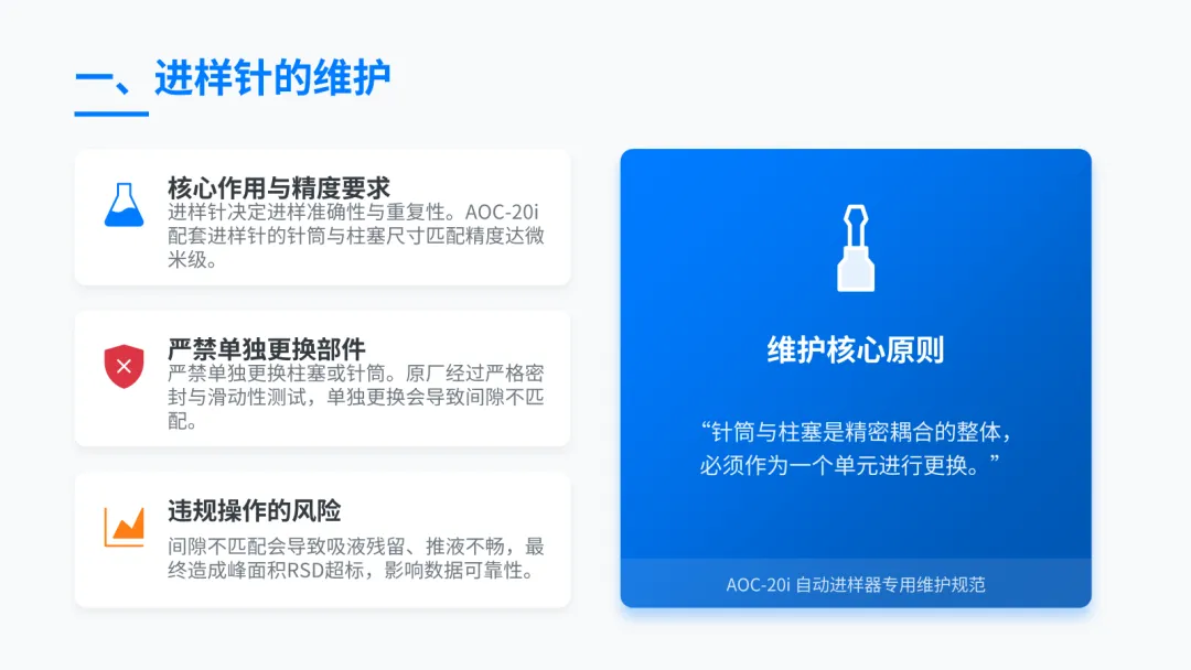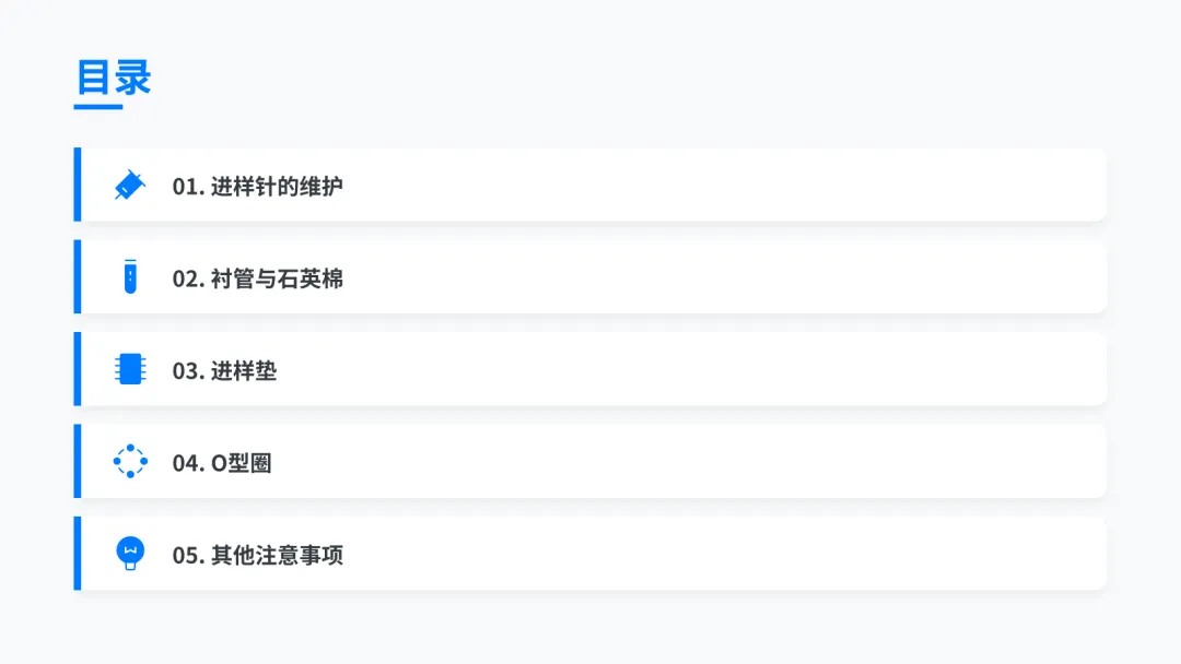 如有需要的小伙伴,私信回复“重复性”免费获取完整PPT哦!本次分享将围绕五个核心方面展开,分别是进样针的维护、衬管与石英棉的配置、进样垫的更换、O型圈的检查以及其他一些影响重复性的注意事项。接下来,我们将逐一进行详细讲解。