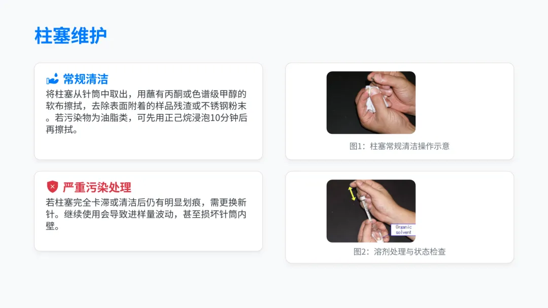 进样针是样品进入色谱系统的第一道关口,它的状态直接影响进样量的准确性。这里要特别强调的是,像AOC-20i这类精密进样针,其针筒和柱塞是精密耦合的,严禁单独更换,否则会严重影响分析结果的重复性。柱塞的维护分为常规清洁和严重污染处理。日常使用中,我们可以用丙酮或甲醇擦拭柱塞表面。如果遇到油脂类污染物,可以先用正己烷浸泡。但如果柱塞出现卡滞或明显划痕,就必须更换新针,不能继续使用,以免造成更大的损坏。
