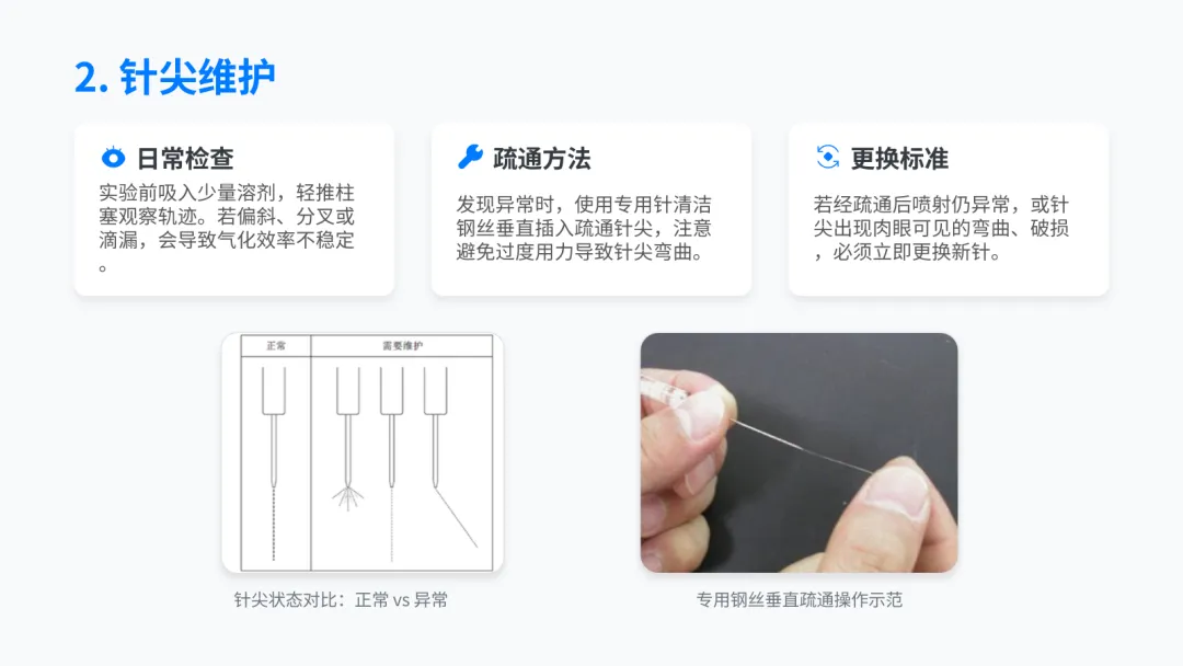 针尖的状态同样至关重要。我们可以通过观察溶剂喷射轨迹来判断针尖是否正常。如果发现喷射异常,可以用专用工具进行疏通。但如果针尖已经损坏,就必须更换。这张图清晰地展示了正常和需要维护的针尖状态,以及正确的疏通方法。