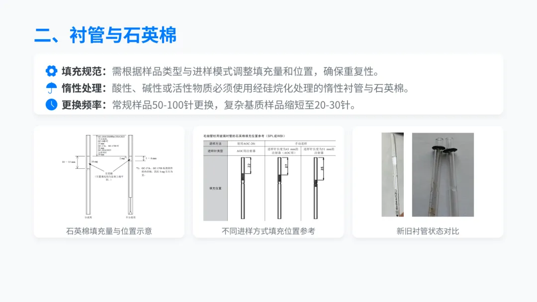 衬管与石英棉的填充量和位置需要根据样品和进样模式来调整。同时,对于特殊样品要使用惰性衬管。定期更换衬管和石英棉是保证重复性的关键,尤其是在分析复杂样品时,更换频率要更高。这几张图展示了正确的填充方法和新旧衬管的对比。