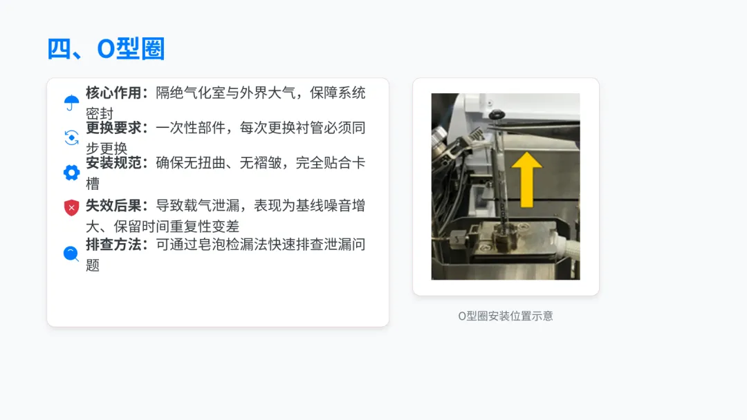 O型圈是一次性部件,每次更换衬管时都必须更换新的O型圈。安装时要注意正确方法,确保密封良好。如果O型圈失效,会导致载气泄漏,影响分析结果。我们可以通过简单的皂泡检漏法来检查是否存在泄漏。