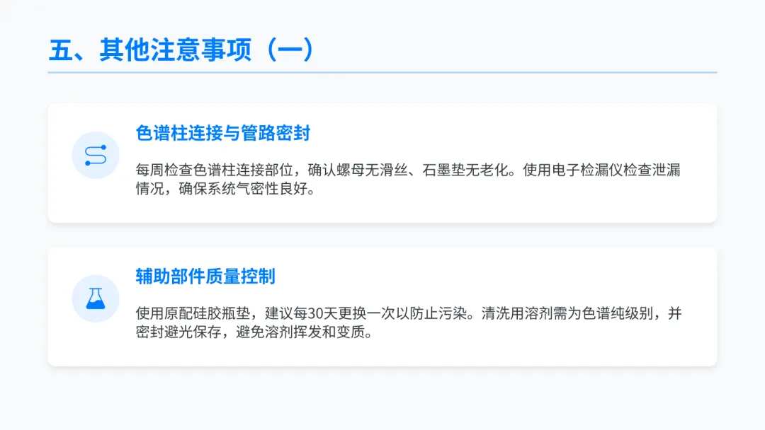 除了前面提到的核心部件,还有一些其他细节也会影响重复性。比如,要定期检查色谱柱的连接和管路的密封性,确保没有泄漏。同时,辅助部件如清洗瓶的瓶垫也要定期更换,使用高纯度的溶剂进行清洗。