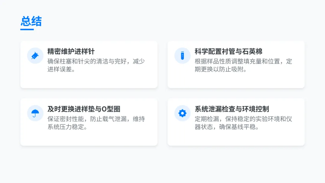总结一下,要提高气相色谱分析的重复性,我们需要从进样针、衬管石英棉、进样垫、O型圈等核心部件的维护入手,同时做好系统的泄漏检查和环境控制。只有将这些精细化的维护措施贯穿于分析的全过程,才能获得可靠的数据。