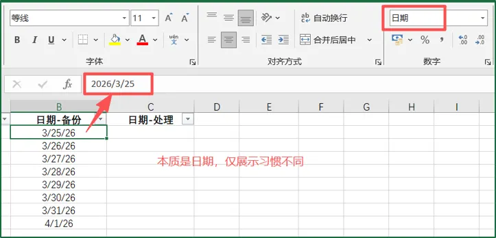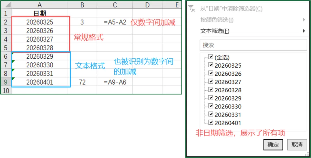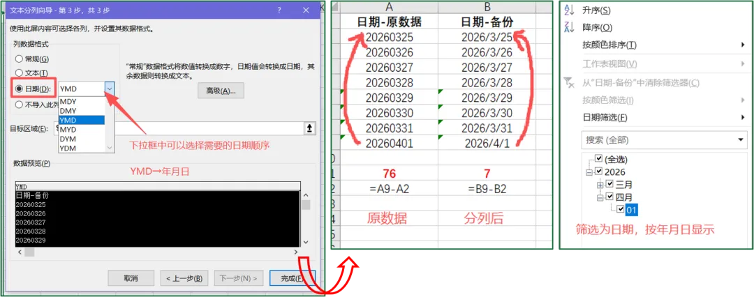 适用场景:系统导出的日期是8位纯数字或纯文本(如20260316),Excel识别为数值或文本,无法进行日期计算或筛选。
