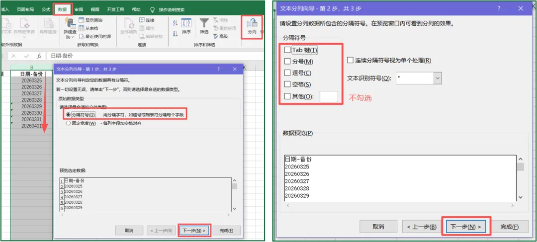 ①选中备份后的数字日期列,依次点击【数据-分列】;