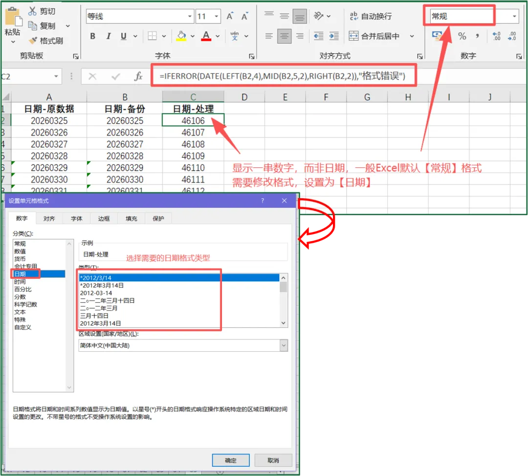 =IFERROR(DATE(LEFT(B2,4),MID(B2,5,2),RIGHT(B2,2)),"格式错误")