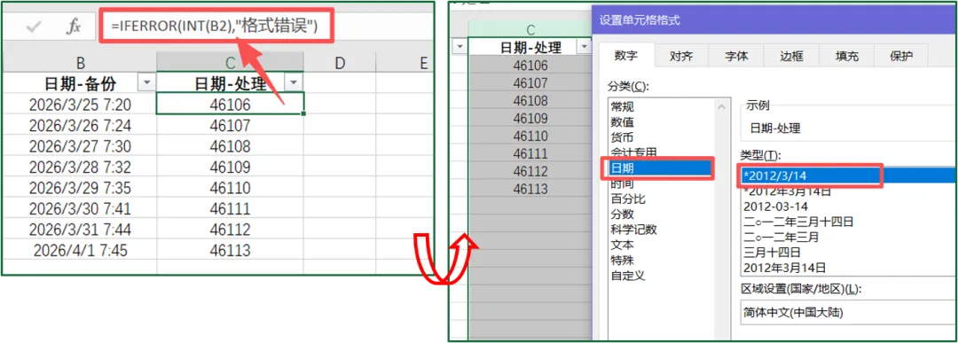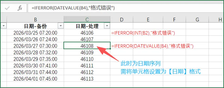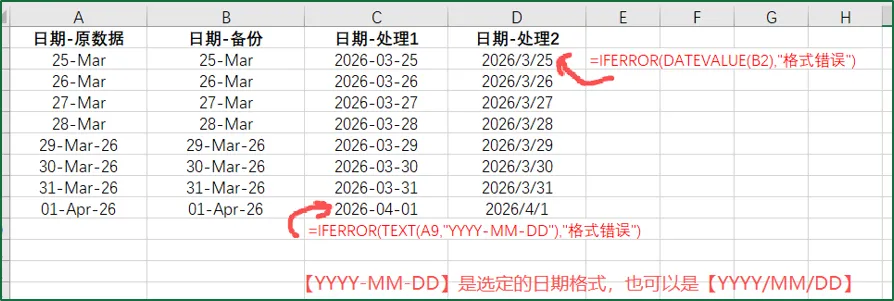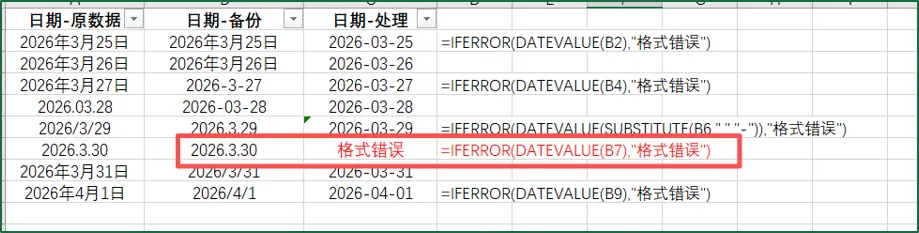 =IFERROR(DATEVALUE(B2),"格式错误")