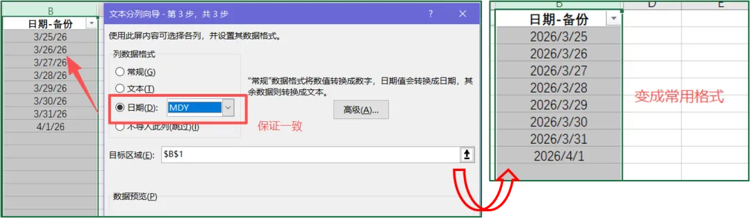 情况2:原数据为文本格式,转换成习惯的日期格式