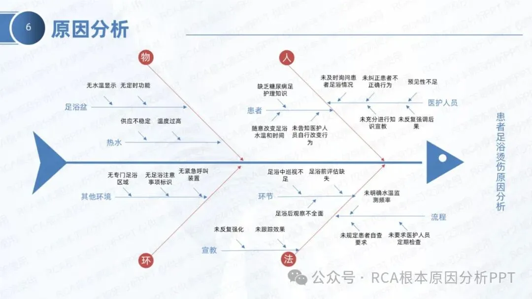 采用鱼骨图分析这一直观的问题分析工具,将患者足浴烫伤问题置于鱼头位置,从多个维度分支展开分析。