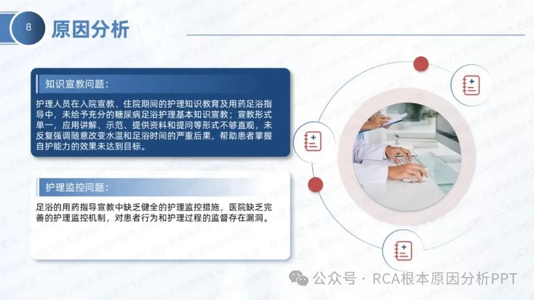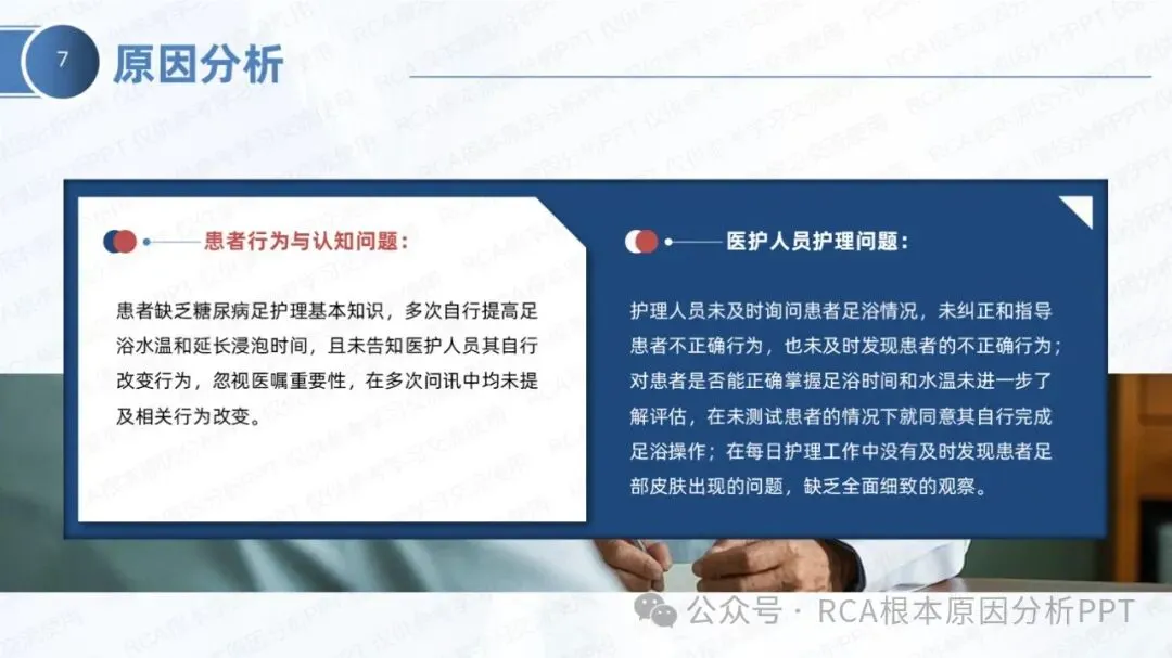 护理人员未及时过问患者足浴状况,未对患者的错误行为加以纠正与指导,也未能及时察觉;对患者掌握足浴时间和水温的能力未深入了解评估,便允许其自行足浴;日常护理工作中,未能及时发现患者足部皮肤问题,观察不够全面细致。