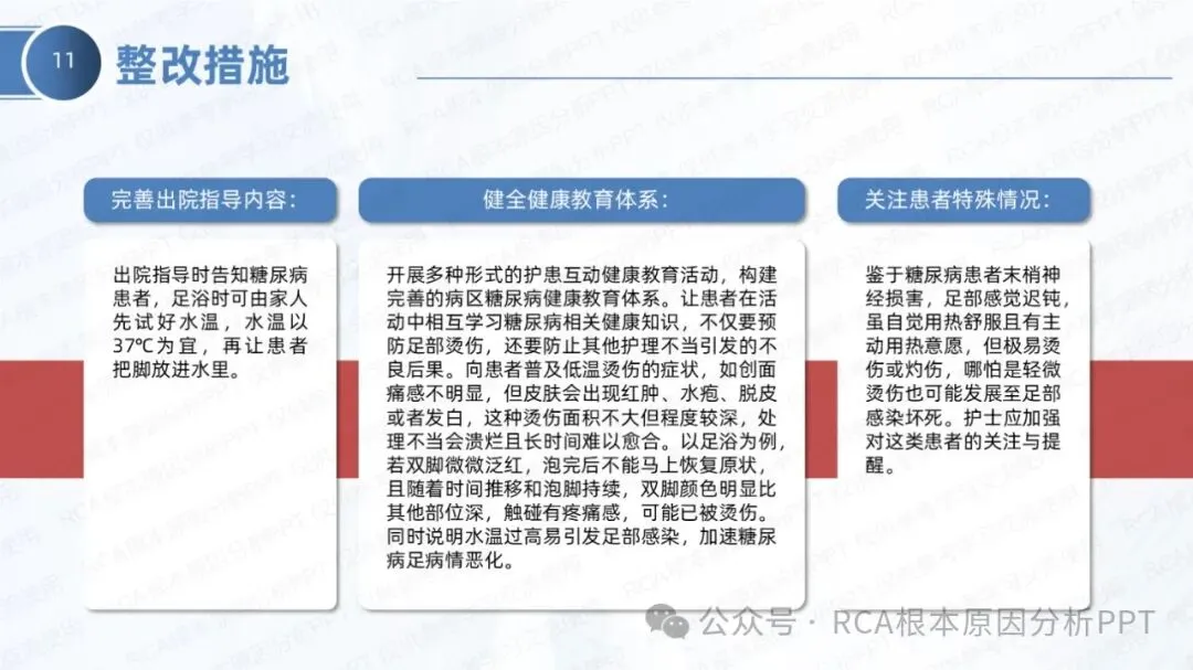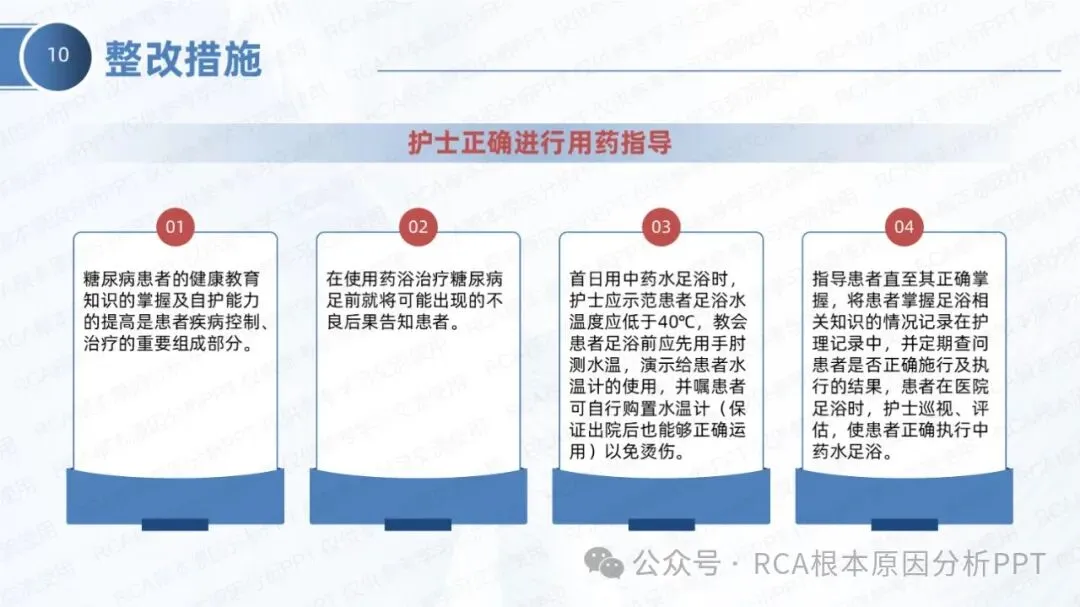护理人员在入院宣教、住院期间护理知识教育及用药足浴指导时,未充分进行糖尿病足浴护理基本知识宣教;宣教形式单一,仅采用讲解、示范、提供资料和提问等方式,不够直观,未反复强调随意改变水温和足浴时间的严重后果,致使帮助患者掌握自护能力的目标未达成。
