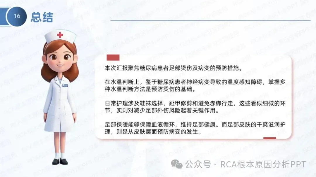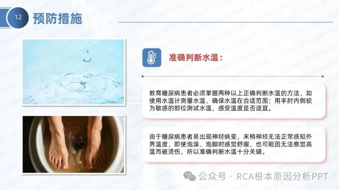 本次汇报聚焦糖尿病患者足部烫伤及病变的预防措施。在水温判断方面,鉴于糖尿病患者神经病变导致的温度感知障碍,掌握多种水温判断方法是预防烫伤的基础。日常护理涵盖鞋袜选择、趾甲修剪和避免赤脚行走等环节,这些看似细微之处,实则对减少足部外伤风险至关重要。足部保暖能够保障血液循环,维持足部健康。而足部皮肤的干爽滋润护理,则是从皮肤层面预防病变的发生。