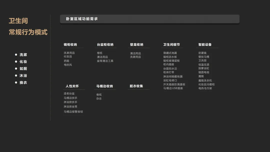 从玄关的收纳与消杀,到厨房的洗切炒动线;从卧室的衣物分区,到卫浴的干湿智能;再到阳台的家政与休闲,我们用一套完整的精细化设计系统,覆盖收纳、暖通、智能、储物、设备、电器、电路、水路、灯光、生活习惯十大维度。
