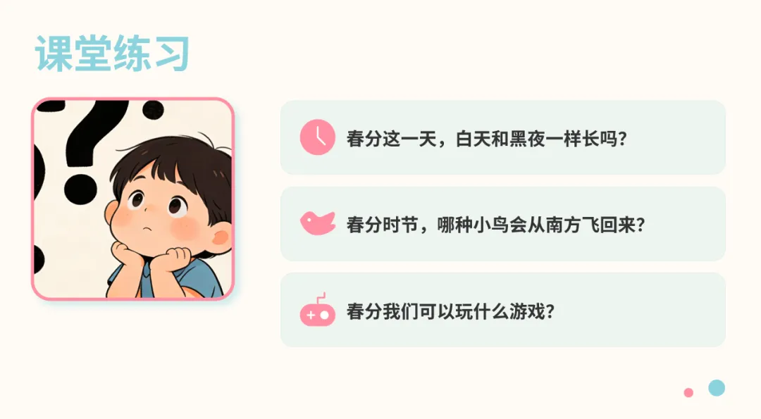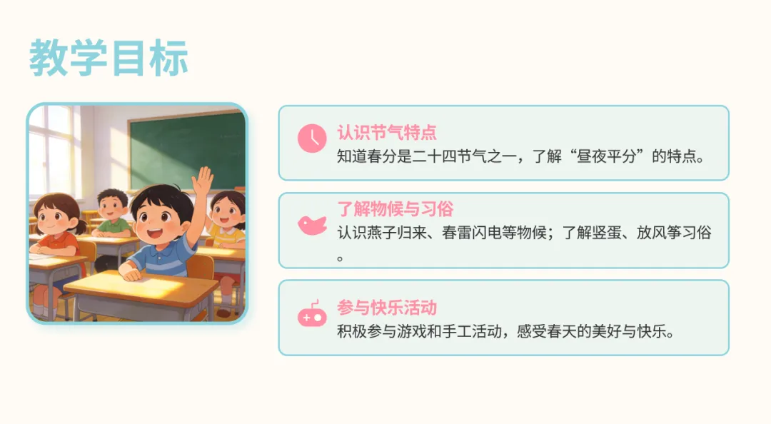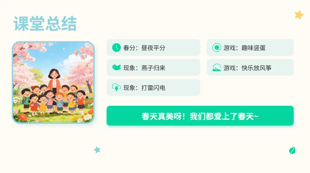 课堂总结:教师带领幼儿回顾本节课所学内容,总结春分的特点、物候和习俗,再次强调春天的美好。