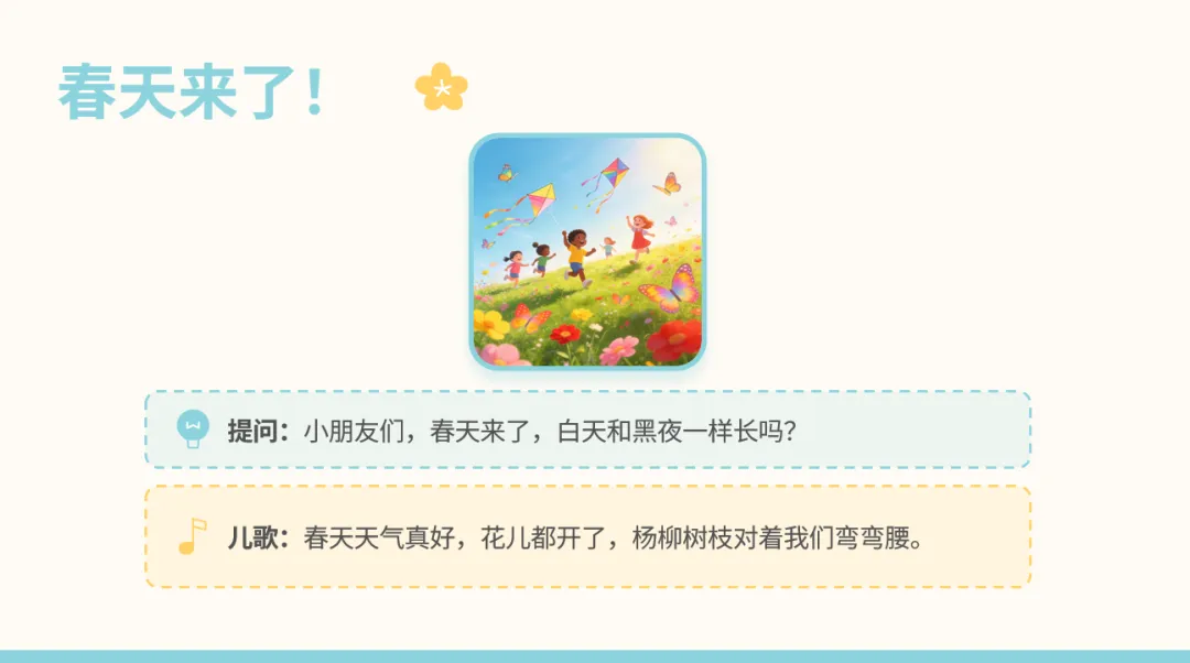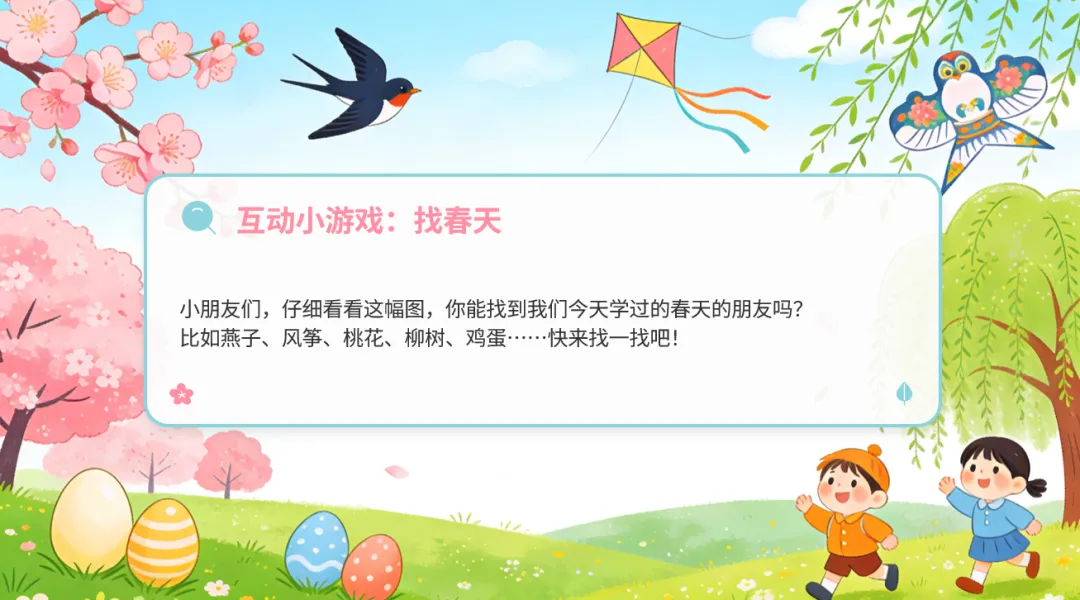 展示 PPT 中的 “找春天” 场景图,引导幼儿寻找图中的春天元素(如燕子、风筝、桃花、柳树等),巩固所学知识。
