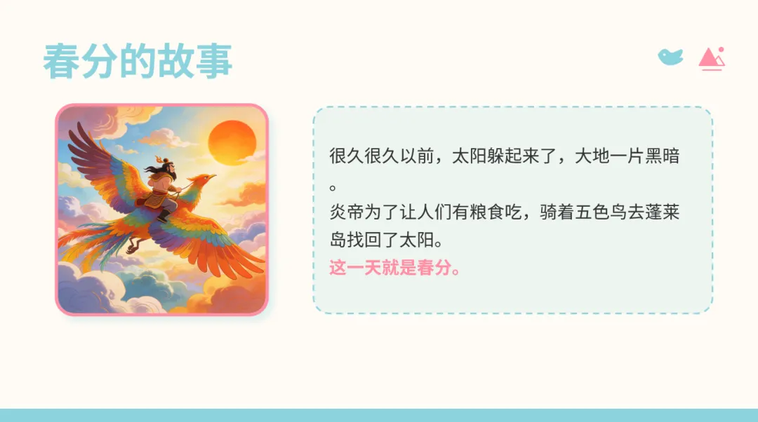 播放炎帝寻日的故事动画或由教师生动讲述,让幼儿了解春分的传说,增加趣味性。