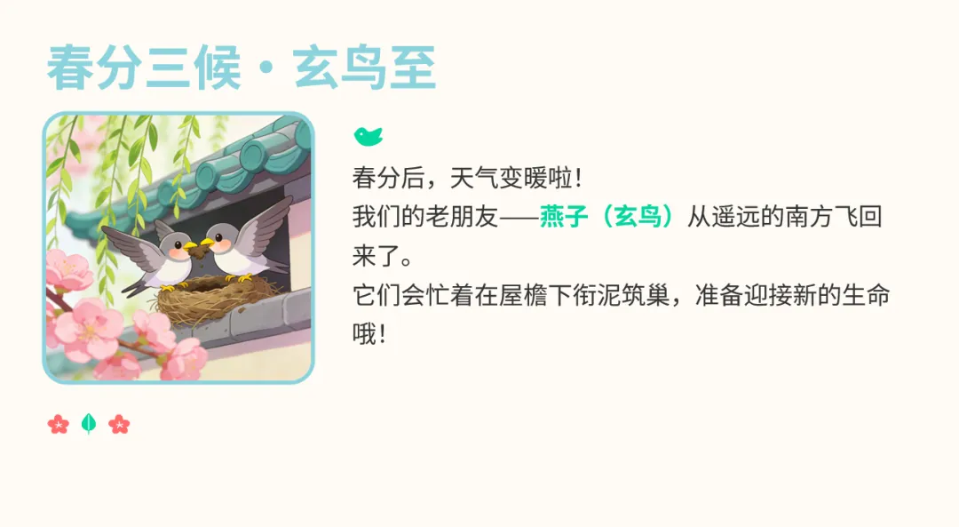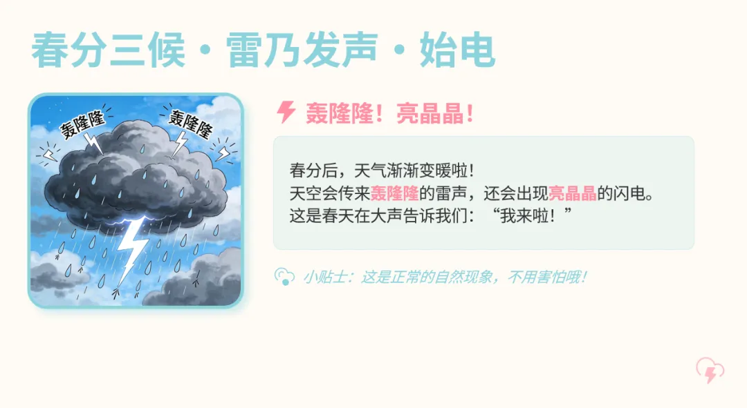 通过 PPT 展示燕子归来、春雷闪电的图片或视频,引导幼儿观察并说出春分时节大自然的变化,理解 “玄鸟至”、“雷乃发声”、“始电” 的含义。