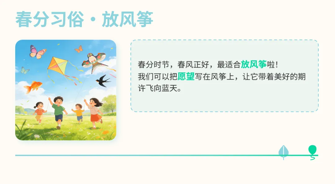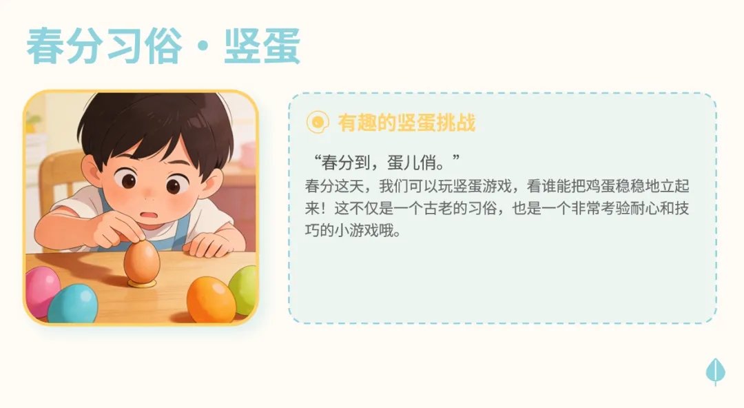 介绍习俗:展示竖蛋和放风筝的图片,讲解春分的传统习俗。