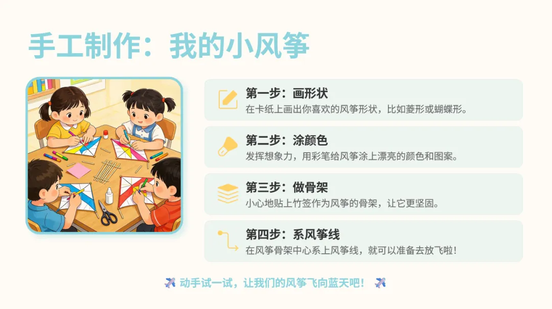 能运用多种材料和工具,动手制作简单的风筝,发展动手操作能力和创造力。